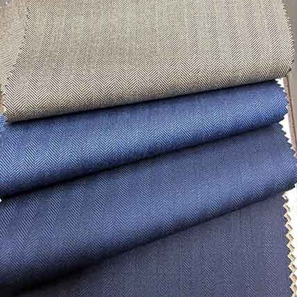 精緻なヘリンボーン織りが織り成すブルーとベージュの絶妙なグラデーションが、落ち着きと個性を兼ね備えます。